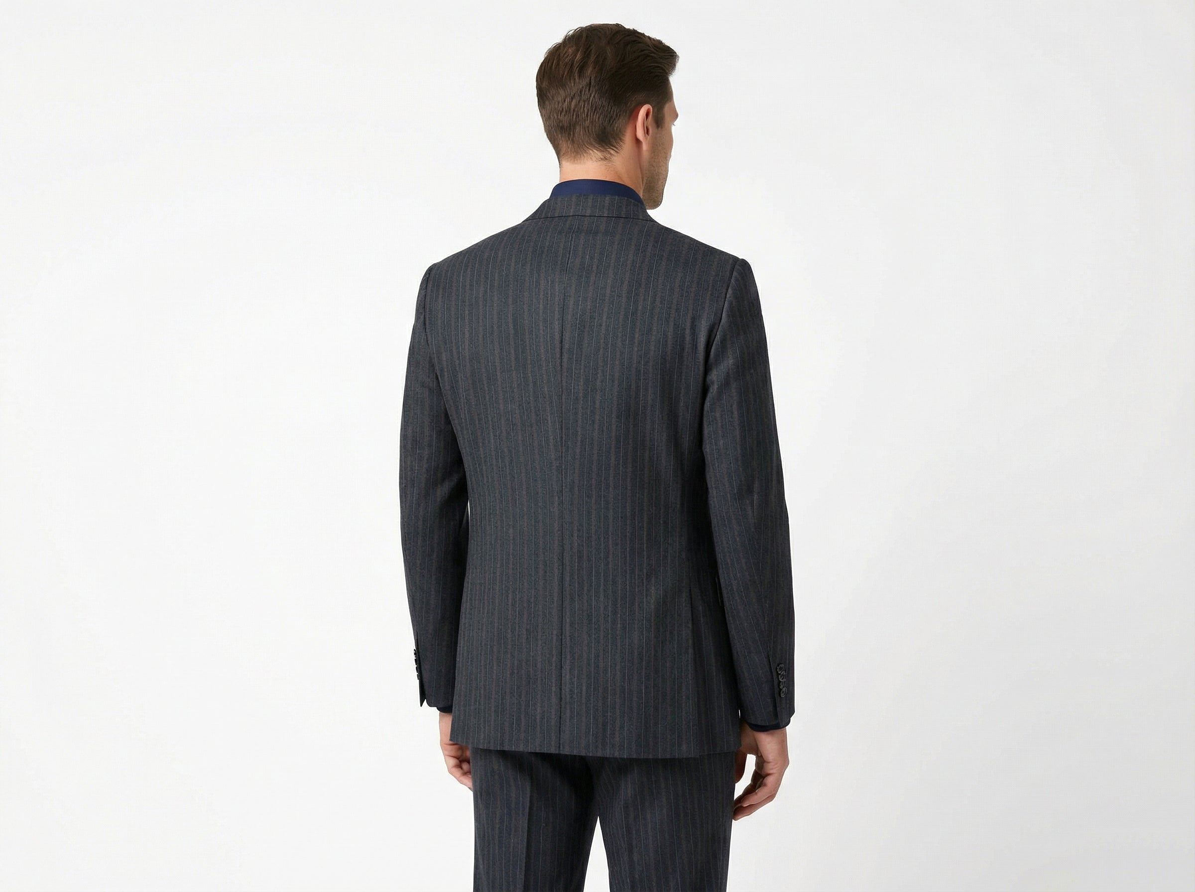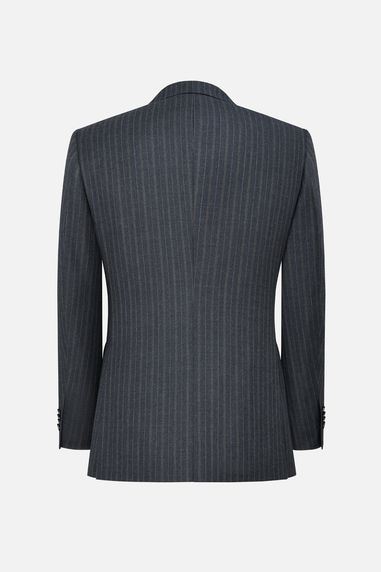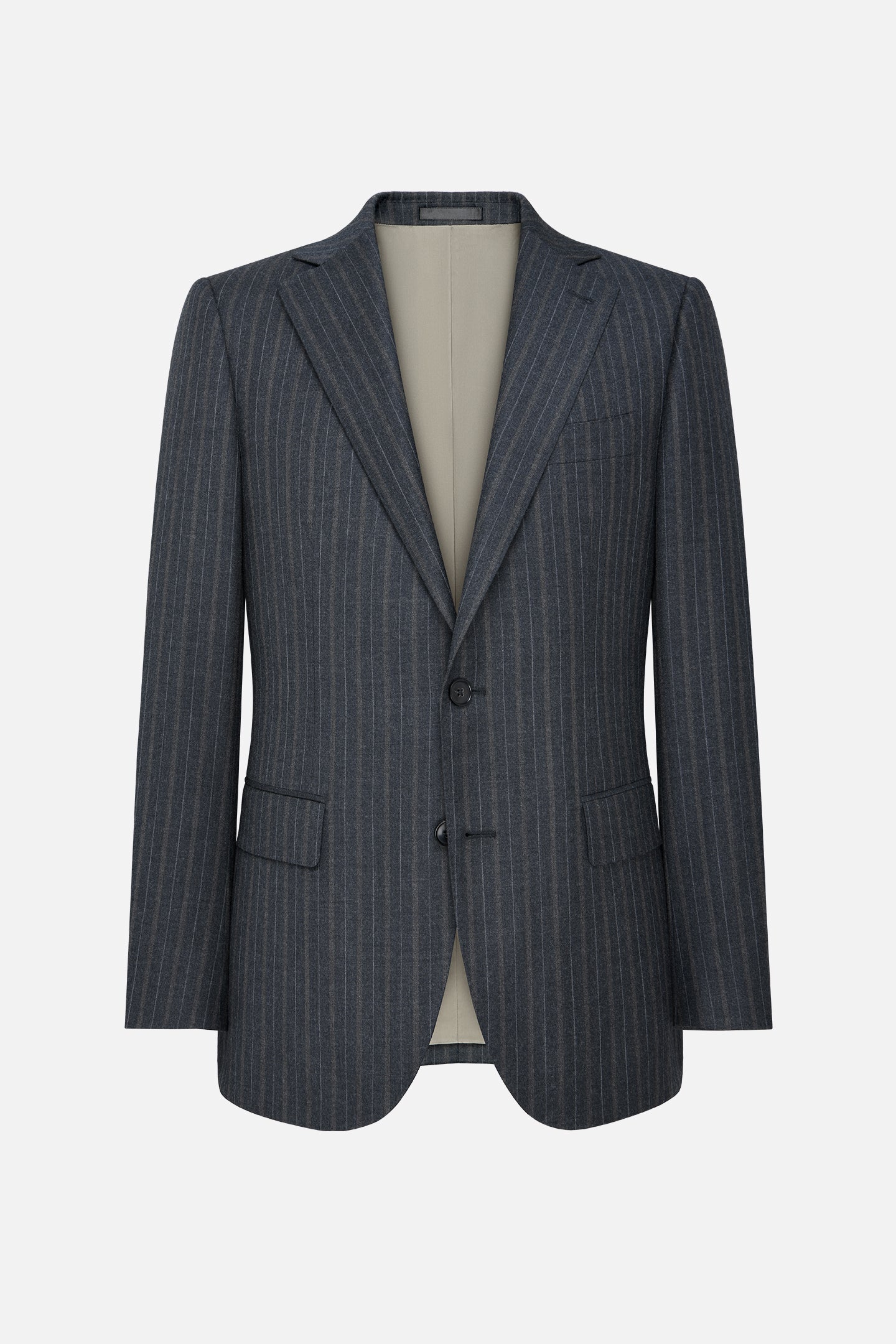 The vertical stripe subtly elongates the figure and adds depth to the overall look. A welt chest pocket and flap pockets are precisely crafted, reflecting attention to detail and a high standard of workmanship. The structured shoulder line and carefully tailored construction ensure a sharp drape and lasting comfort.