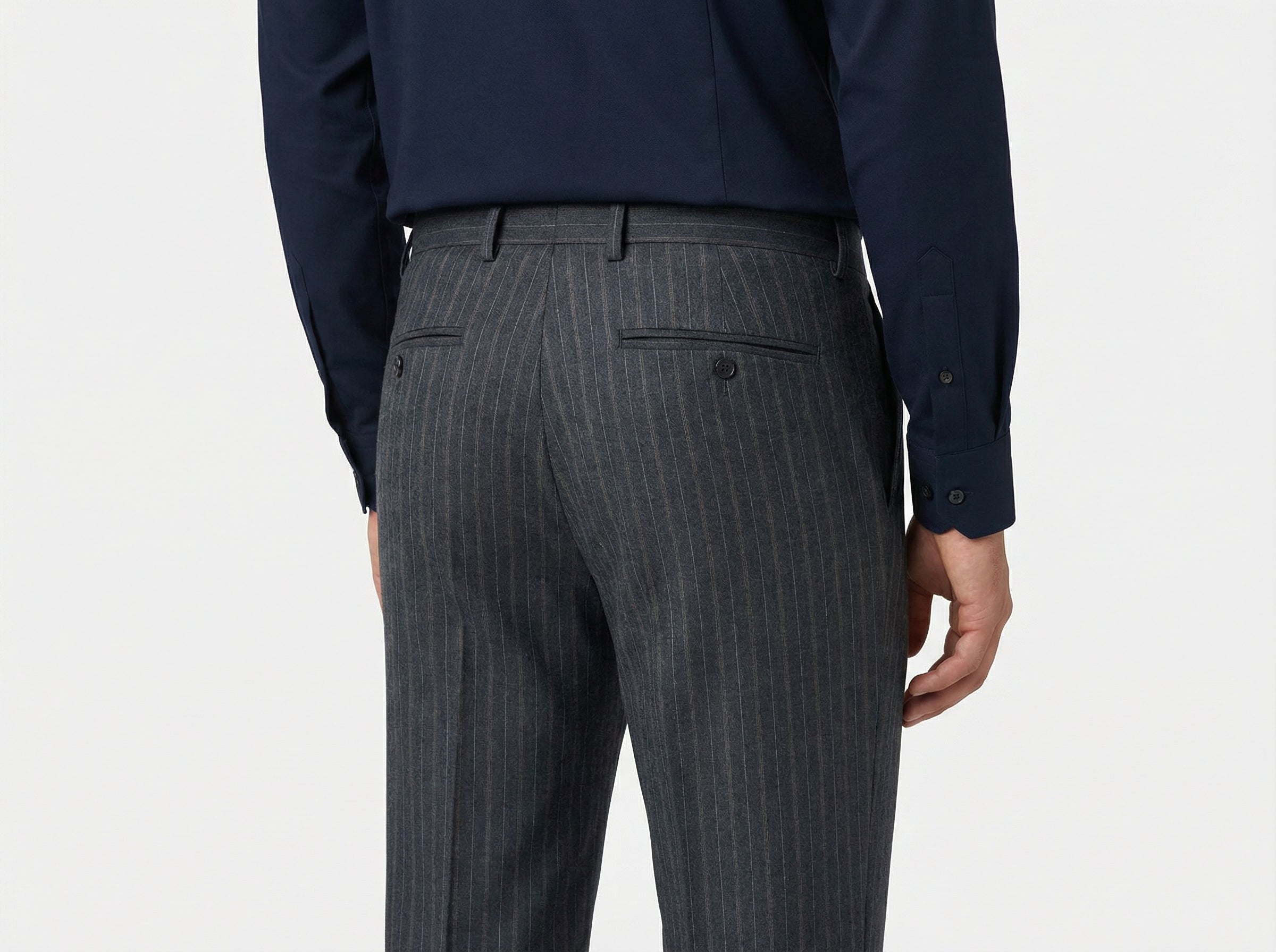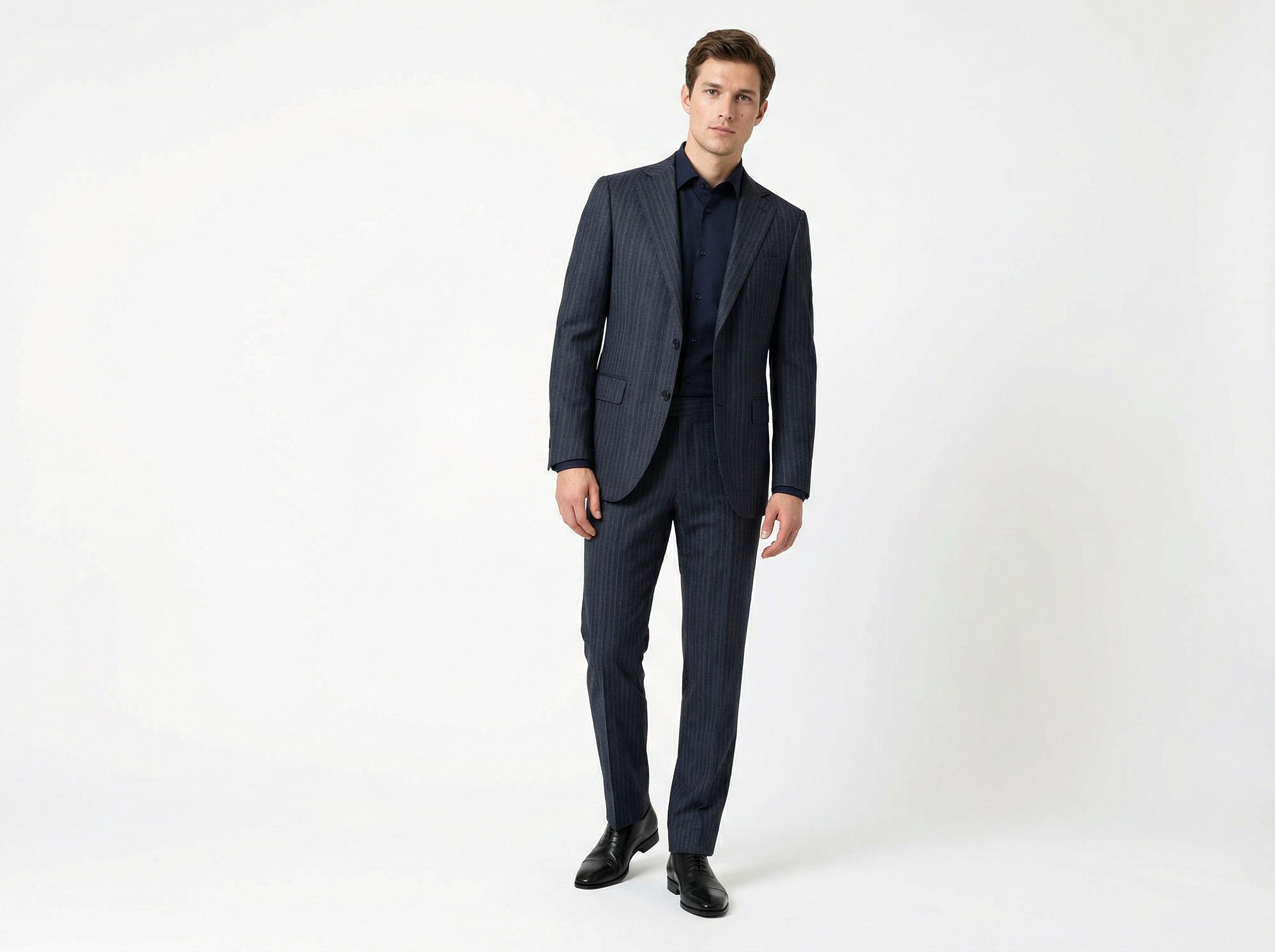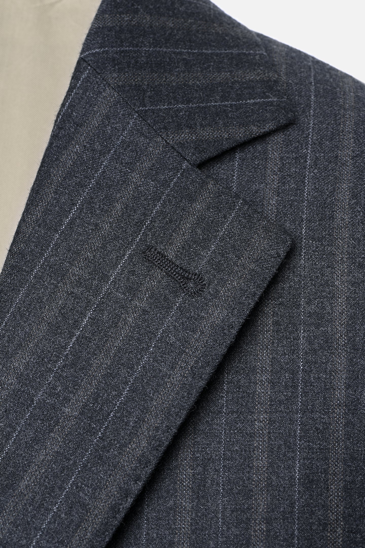 The vertical stripe subtly elongates the figure and adds depth to the overall look. A welt chest pocket and flap pockets are precisely crafted, reflecting attention to detail and a high standard of workmanship. The structured shoulder line and carefully tailored construction ensure a sharp drape and lasting comfort.