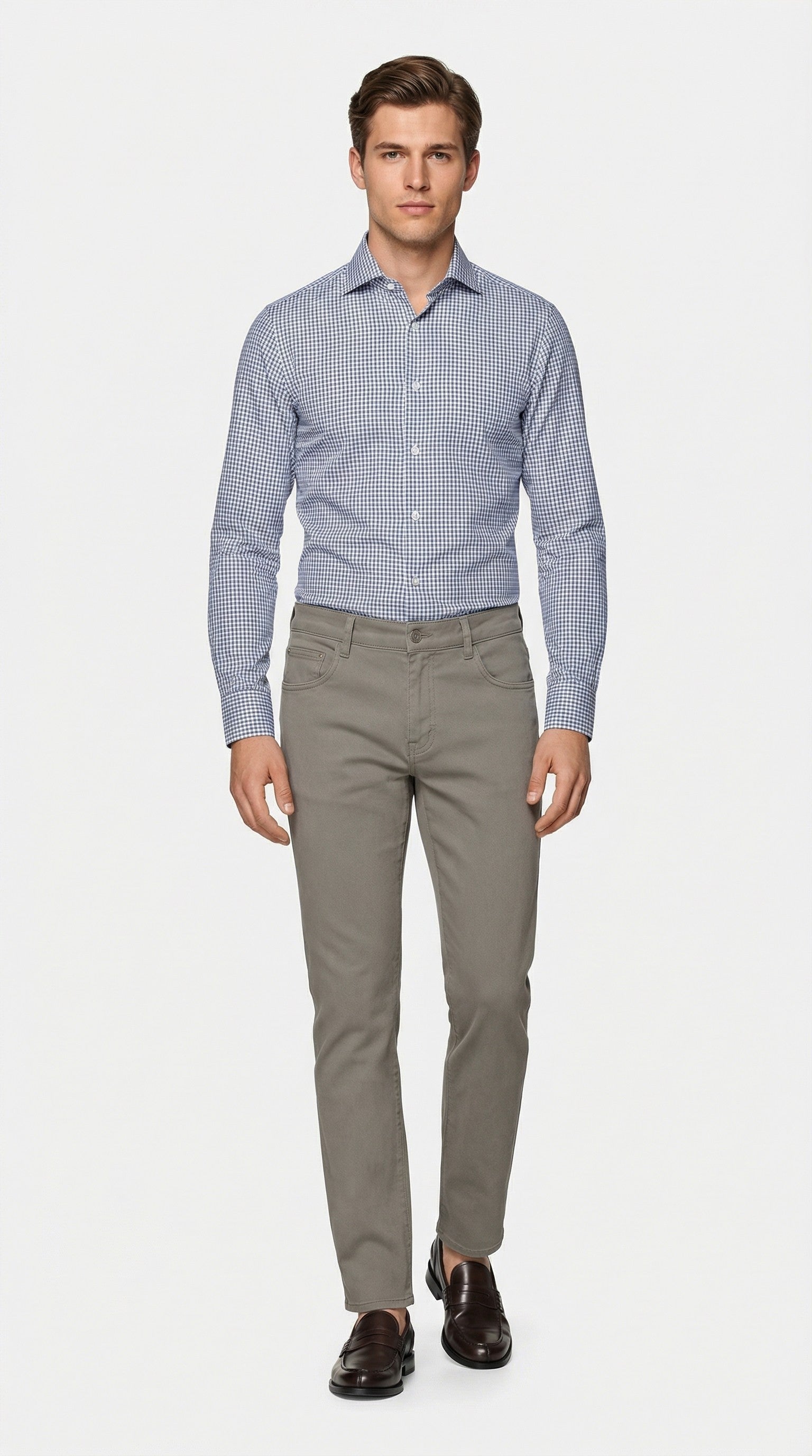 Un'elegante camicia da uomo a maniche lunghe dalla vestibilità sartoriale. Presenta un colletto classico e una chiusura con bottoni, che le conferiscono un look versatile ed elegante. Anche i polsini sono abbottonati, il che ne esalta l'aspetto raffinato. A seconda del tessuto scelto, può avere uno stile più formale o casual, rendendola adatta sia ad outfit sofisticati che a quelli quotidiani.